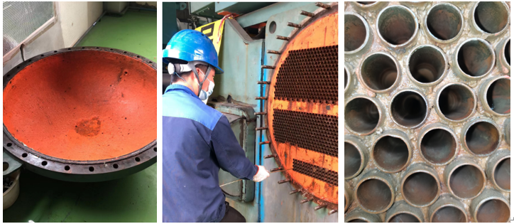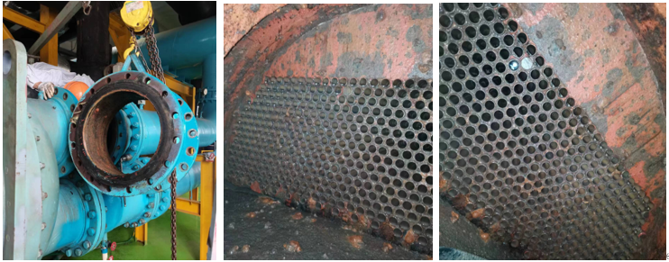 本次清洗僅做通炮清洗,無(wú)需化學(xué)清洗,主要是客戶要打開(kāi)端蓋檢查冷凝器內(nèi)的腐蝕情況、銅管內(nèi)部的結(jié)垢情況。