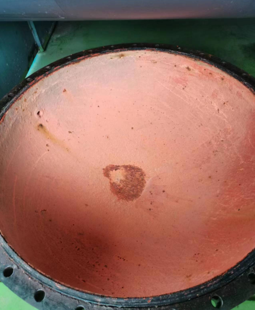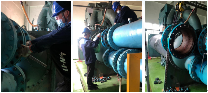 由于該制冷機(jī)已經(jīng)使用了18年左右,很長(zhǎng)時(shí)間沒(méi)有檢查冷凝器的進(jìn)水端,因此本次對(duì)冷凝器的進(jìn)水端管路法蘭進(jìn)行拆卸,以檢查進(jìn)水端的腐蝕情況。